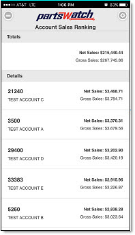 Displays the Account Sales Ranking report. Available to only those PWMobile devices with User Security permission to access the PartsWatch application's Sales Analysis suite of reports.