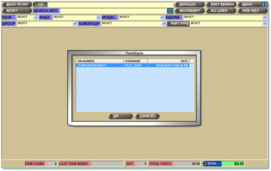'VIN NUMBER' - Displays the VIN. The VIN values remain in the pop-up until they are purged from the PartsWatch application.