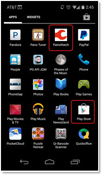 The following screen is an example of an Android mobile device that has the PWMobile application called PartsWatch (circled in red) already loaded. The Play Store application (circled in red) must be used to find and download the PWMobile application.