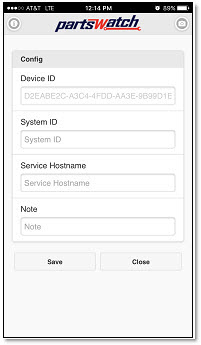 Similar to the PartsWatch DATABASE CONFIGURATION screen, the 'Config' screen connects the mobile device to a PartsWatch application database. Note: It is possible to connect a mobile device to multiple PartsWatch databases but only one PartsWatch database can be accessed at a time.