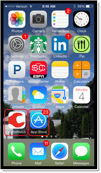 The following screen is an example of an iOS mobile device (e.g., iPhone) that has the PWMobile application (circled in red) already loaded. The App Store application (circled in red) must be used to find and download the PWMobile application.