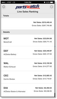 Enables store owners and managers to scroll through a list of their mfg line sales (ranked in descending order) for any date range and any Store Group. Note: The sales information displayed on the mobile device is not similar to any PartsWatch report but could be thought as an extension of the Line Sales Report.