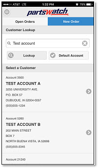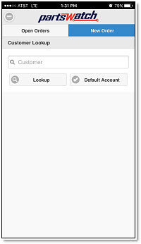 On the 'New Order' screen, tap 'Default Account' to use the store's 'DEFAULT ACCOUNT' on the STORE INVOICE OPTIONS screen in the PartsWatch desktop application or type in a customer and tap 'Lookup'. Search for a customer by name (full or partial), account number, account code, or phone number. Tap 'Open Orders' in the navigation bar to return to the list of open orders.