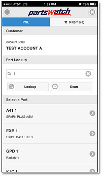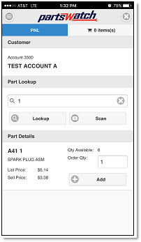 On the 'PNL' screen, tap the 'Scan' button to scan a bar code to look up a part or type in a part to look up. You can search for a part by part number, UPC, SKU, product, alias, or OEM number.