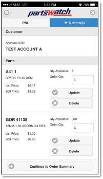 The 'Shopping Cart' screen displays the list of parts on the order. Change the 'Order Qty' (if necessary) and tap 'Update' or tap 'Delete' to remove the part from the order (a confirmation prompt displays before the part is removed). Tap 'PNL' in the navigation bar to add more parts to the order. Tap 'Continue to Order Summary' to review the order.