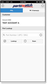 After a selecting a customer from the list of matches, the Part Number Lookup ('PNL') screen displays. If 'Default Account' is tapped or only one matching customer is found when 'Lookup' is tapped, the 'PNL' screen displays immediately.