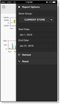To change the current report options settings, tap the Options icon, or swipe the screen from right-to-left to display the 'Report Options' panel. Change 'Store Group' and/or 'Date Range', as applicable.