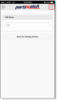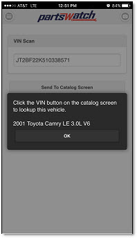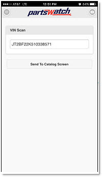 Tap the 'Send To Catalog Screen' button to send the vehicle's VIN to the PartsWatch application's pop-up that displays a list of recently scanned VIN values.