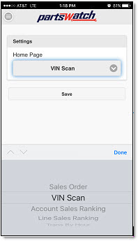 Tap the 'Home Page' drop-down arrow to select an available application function as the 'Home' screen. The list of available PWMobile application functions is based on the User Security permissions in the PartsWatch application.