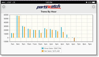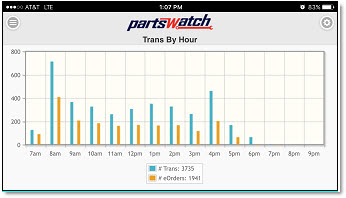 Displays the Trans By Hour report. Available to only those PWMobile devices with User Security permission to access the PartsWatch application's Transaction By Hour Report.