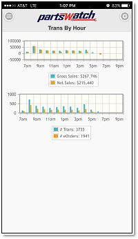 Tap the 'Trans By Hour' menu item to open the 'Trans By Hour' screen. Two graphs immediately run against the PartsWatch database using the report option settings that are currently set.