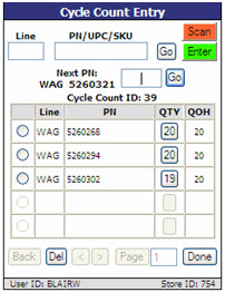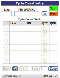 The Cycle Count function enables the physical counting or scanning items in the inventory and logs them through the RF Device in order to capture the counted quantities in an PartsWatch database. Simultaneously, the on hand inventory at that point in time is noted so that, at a later point, a report can be printed listing any discrepancies between the physical count and system inventory. Cycle counts are stored and maintained for a user-determined time frame and then cleared.