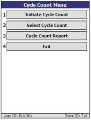- Having no parameter conflicts, generates the Cycle Count ID. The number consists of a sequential number (001) that is generated by the application and is incremented for all cycle counts for that store from 001 to 999, at which point it recycles to 001. This, in combination with the three-character user ID (USR) and a six-character date (MMDDYY) in either the US or Canadian format (as indicated by the PDA Regional Settings), identifies the Cycle Counts.