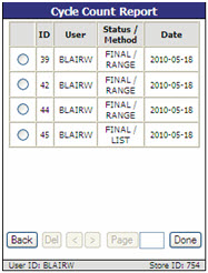 Tap the 'Select Cycle Count' option on the 'Cycle Count Menu' screen to recall a list of active cycle counts to edit, complete, or finalize.