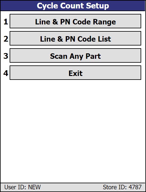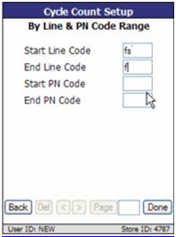 - 'Line & PN Code Range' - Displays the 'Cycle Count Setup - By Line & PN Code Range' screen.