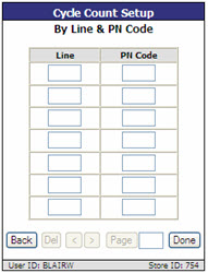 Displays the 'Cycle Count Setup' screen used to initiate the Cycle Count.