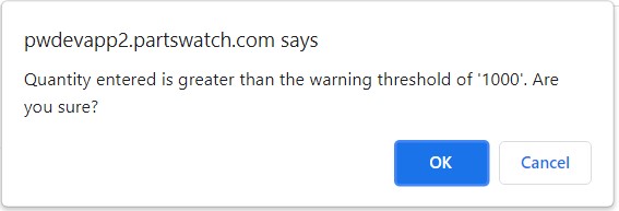 If parts are scanned or entered and the upper limit is exceeded, a message prompt is displays with the text: "Quantity entered is greater than the warning threshold of '1000'. Are you sure?" with an 'OK' and 'Cancel' button.