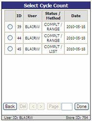 Displays the 'Select Cycle Count' screen used to recall a list of active cycle counts.