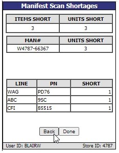 - If 'OK' is clicked and there are missing parts from the manifest, a screen is displayed labeled 'Manifest Scan Shortages'.