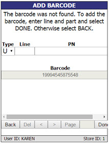 Tap to add the bar code to the Barcode line when a valid 'Line' and 'PN' are entered.