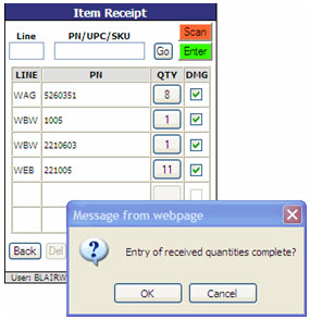 Tap 'Done' on the 'Item Receipt' screen. The system checks for battery damaged/overage, and when completed, displays the message, "Entry of received quantities complete?"