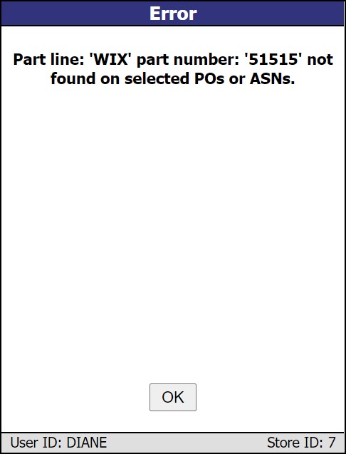If a part is entered or scanned in this field that is not found on the selected PO(s) or ASN(s), an Error message displays.