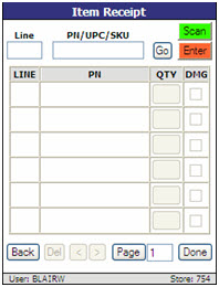 Tap 'Done'. The POs/ASNs are no longer accessible by another RF Device or PartsWatch user. The 'Item Receipt' screen displays for scanning or entry of items that are being received for the selected POs/ASNs.
