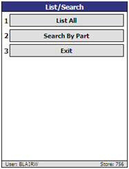 Tap to either list all POs or ASNs that are available for receipt, or search for POs or ASNs containing a particular part number. These functions query all POs in the selected store that are open and have a PO 'Status' of Final (FIN), On Order (ORD), On Back Order (OBK), or ASN (ASN) for that store.