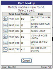 If multiple matches are found on the number in the inventory file, the 'Part Lookup' screen displays with a list of matches.