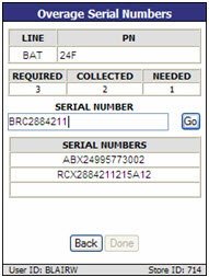 After the 'Item Receipt' for damaged battery process is completed, the system checks for any overages recorded for batteries and then displays the 'Overage Serial Numbers' screen. The same information is required as the 'Damaged Serial Numbers' screen.