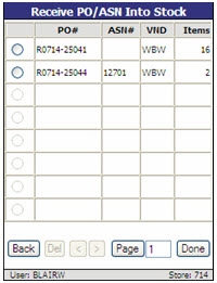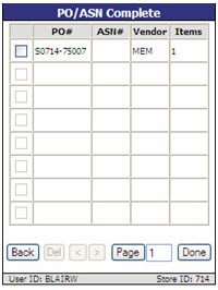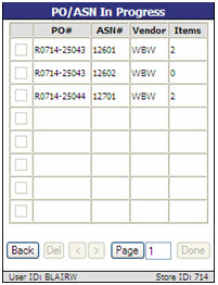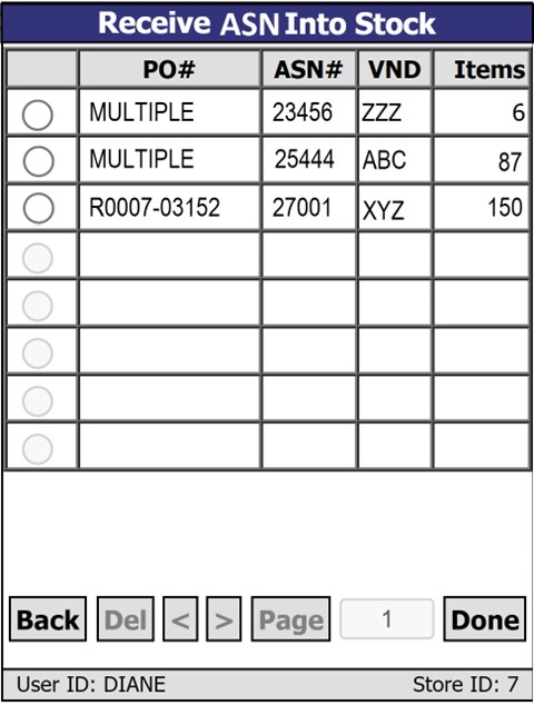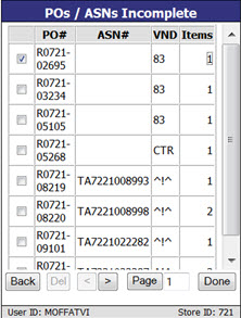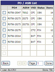 - By choosing the 'List All' or 'Search By Part' option from the 'List POs/ASNs' menu, selecting POs/ASNs from there, and tapping'Done'. If the screen is accessed using this method, the selected POs/ASNs display in the grid upon accessing the screen. More POS/ASNs may be manually added to the list.