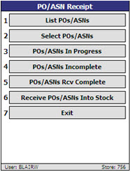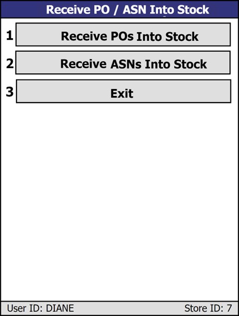 The 'Receive POs/ASNs Into Stock' option displays the 'Receive PO/ASN Into Stock' screen used to receive POs/ASNs into stock.