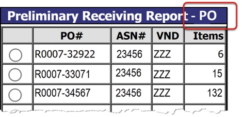 Select either the 'Preliminary Receiving Report – PO' or 'Preliminary Receiving Report – ASN' to continue.