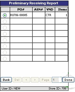 Tap 'Preliminary Receiving Report' from the 'PO/ASN Receipt' menu screen. The complete detailed list of POs/ASNs that are in the Ready to Receive ('CMP') state displays.