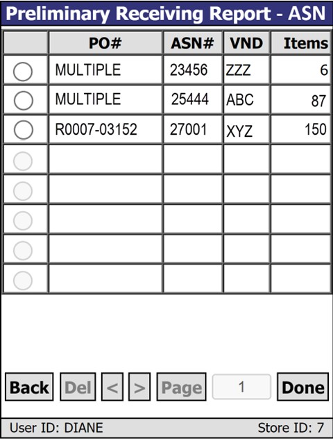 If the 'Preliminary Receiving Report – ASN' is selected, a list of ASNs with a status of 'CMP' (Complete) displays. Select one and tap 'Done' to navigate to the 'Preliminary Receiving Report – ASN' screen on the RF device.
