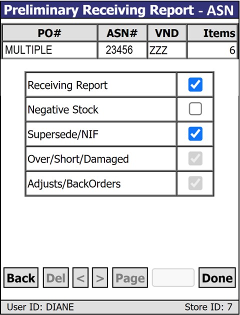 Tap 'Cancel' and the receiving report options screen redisplays with the same PO/ASN still displayed.