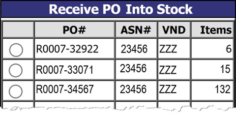 - The desired POs or ASNs can be selected from the 'PO/ASN List' accessed from the 'List All' option on the 'Received Stock Location' screen.