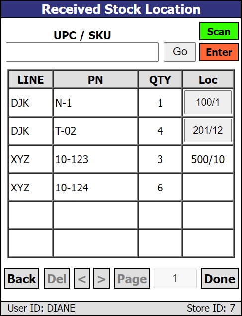 The 'Received Stock Location' screen is used to process parts received on a PO or ASN and place these parts into their respective zone/bin.
