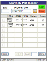 - If a part number is known but not the PO# or ASN#, the 'Search By Part' option may be used. On the 'Search by Part Number' screen, the UPC/SKU can be scanned or the line and part number can be entered of a part. The search will result in any PO or ASN that contains that part. Select the POs and/or ASNs from the checkbox in the first column and select 'Done'.