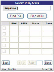 - If the PO# or ASN# is known (all or partial), the 'Select POs/ASNs' option can be used to open the 'Select POs/ASNs' screen. The PO# or ASN# should be entered in the top field and either 'Find PO' or 'Find ASN' should be tapped. From the resulting list, select one or more rows and tap 'Done' to proceed.