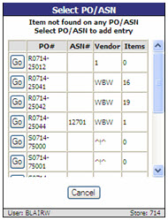 When an item is found in the part file but does not match an item on a PO/ASN, the 'Select PO/ASN' screen displays with the message, "Part not found on any PO/ASN. Select PO/ASN to add entry."