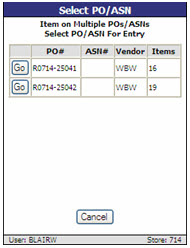 When a selected part for receiving is found on multiple POs/ASNs, the 'Select PO/ASN' screen displays with the message, "Item on Multiple POs/ASNs. Select PO/ASN For Entry."
