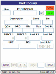 Upon entry of a valid 'Line' and 'PN/UPC/SKU', the following part information is returned: