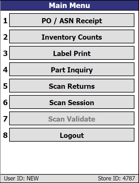 Once properly logged in, the 'Main Menu' displays on the RF Device. Access to the 'Main Menu' functions is controlled by User Security. The following is an example of the 'Main Menu'.