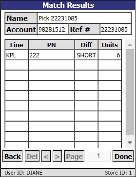 At the top of the 'Match Results' screen, a 'Name' field identifies the pick reference number.