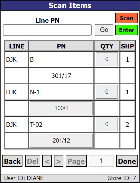 Each part on the pick ticket is represented by two lines. When the 'Scan Items' screen opens, the first line displays the 'LINE', 'PN' (part number), 'QTY' (quantity scanned) and 'SHP' (quantity ordered) displays per item. The second line displays the part's assigned Zone/Bin, centered in the cell under 'PN'. If there is no zone or bin assigned to the part, the cell beneath the 'PN' is blank. If there is a zone assigned, but no bin assigned to the part, only the zone appears as centered text. If there is a bin assigned, but no zone, the bin appears as centered text preceded by a '/' character such as '/5'. If there is a single zone and bin assigned to the part, the display shows the zone and bin centered as text separated by a '/' such as '301/17'. If the part has more than one zone/bin assigned to it, the primary zone/bin is displayed on a button.