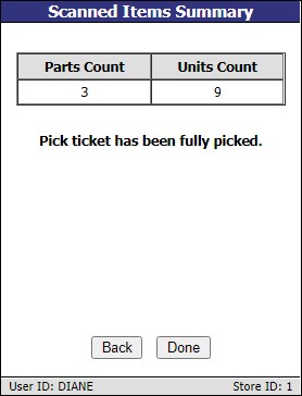 When done, the 'Scanned Items Summary' screen displays the 'Parts Count' (total quantity of unique parts scanned) and the 'Units Count' (total number of units scanned). The message: "Pick ticket has been fully picked." also appears.