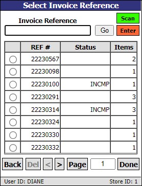 If you tap 'Cancel' the system will save the session and return you to the 'Select Invoice Reference' screen. The session will have a status of 'INCMP' and will remain on the list for future scanning.