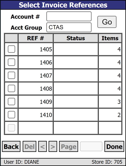 When the 'Scan Multiple Picks' option is selected, the 'Select Invoice References' screen opens, displaying a list of all open pick tickets, to select multiple at once.