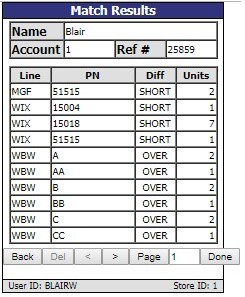 If the comparison results in "any differences" of aggregated scanned quantity to order quantity for any part, then display only the parts that contain differences on the 'Match Results' screen.